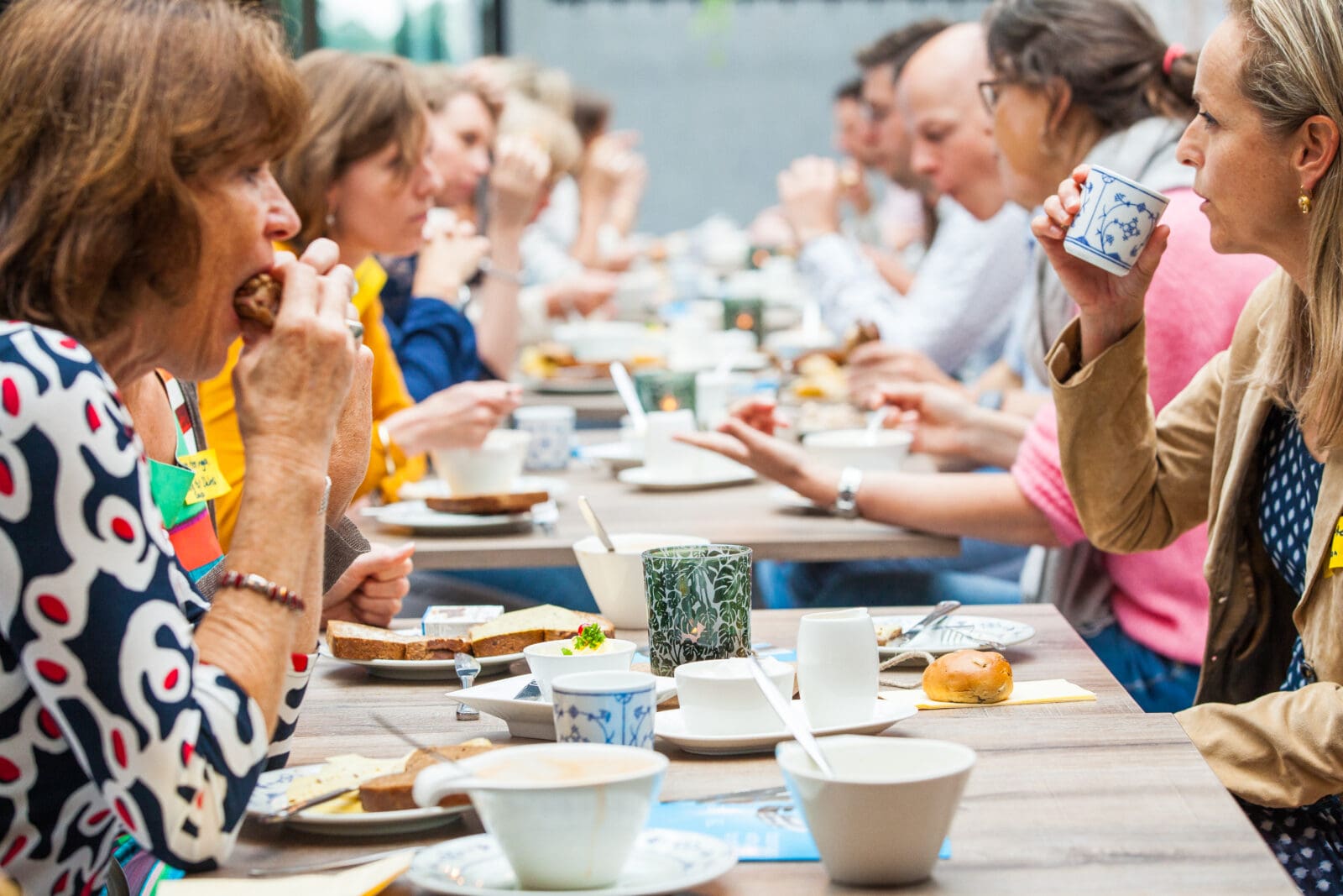Boek onze lunch op tafel en geniet van onze huisgemaakte groentesoep, diverse mini broodsoorten met gevarieerd zoet en luxe hartig beleg, ambachtelijke kroket, boerenrundvleessalade, mini saucijzenbroodjes, zalmsalade met gerookte zalm en koffie, thee, jus d’orange, melk, karnemelk en gekoeld water. Vanaf twee personen, duur 1½ á 2 uur, minimaal één dag van te voren boeken.